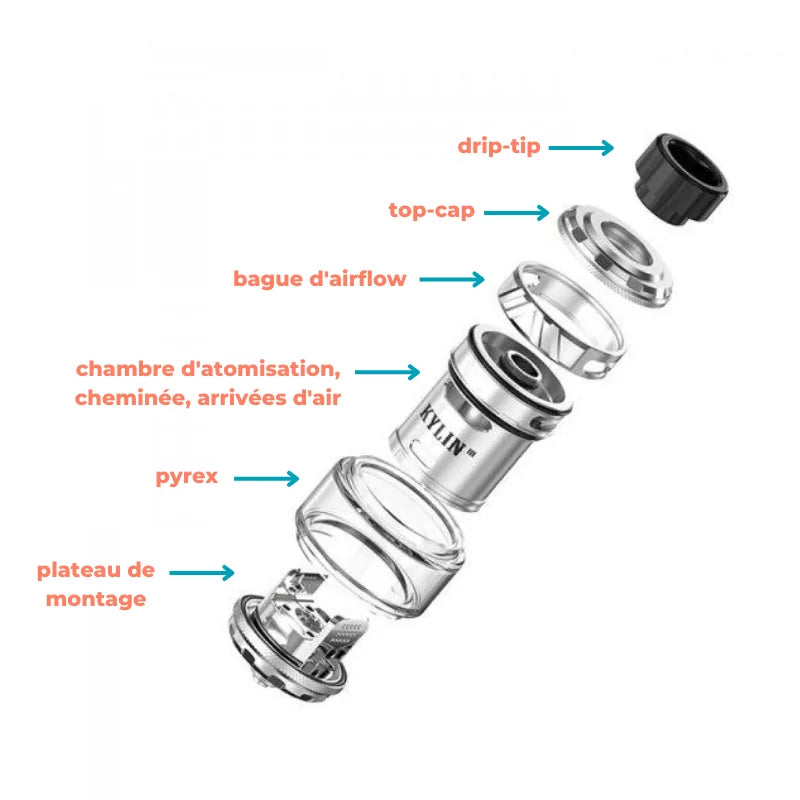L'un des points forts du Kylin V3 RTA est incontestablement la pièce d’usinage permettant de réunir la chambre d’atomisation, la cheminée centrale et les arrivées d’air latérales placées sur les côtés de la cuve de remplissage. Une innovation technique matérialisée par un bloc d’acier unique, permettant un démontage et un nettoyage aisé de votre matériel !